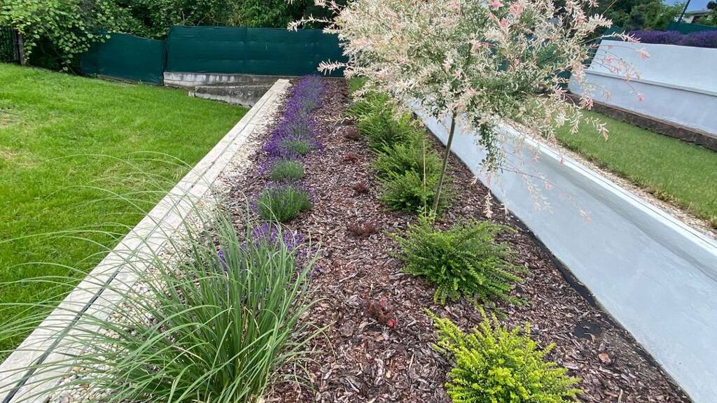 Die Pflege des terrassenförmig angelegten Gartens macht ein automatisches Bewässerungssystem bequem, seine Atmosphäre verspricht echte Entspannung.