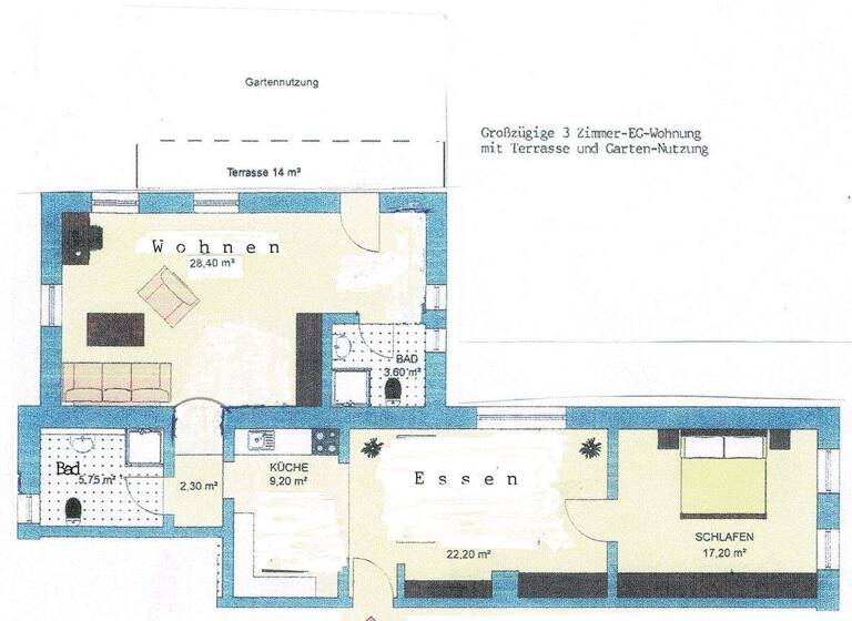Die Wohnung im EG ist sehr hell und großzügig, hat helle Ahorn-Laminatböden. Vor der Wohnung befindet sich noch eine Sonnenterrasse mit ca. 14 qm und anschließend kommt ein Gartenanteil, der von den Mietern genutzt werden kann.