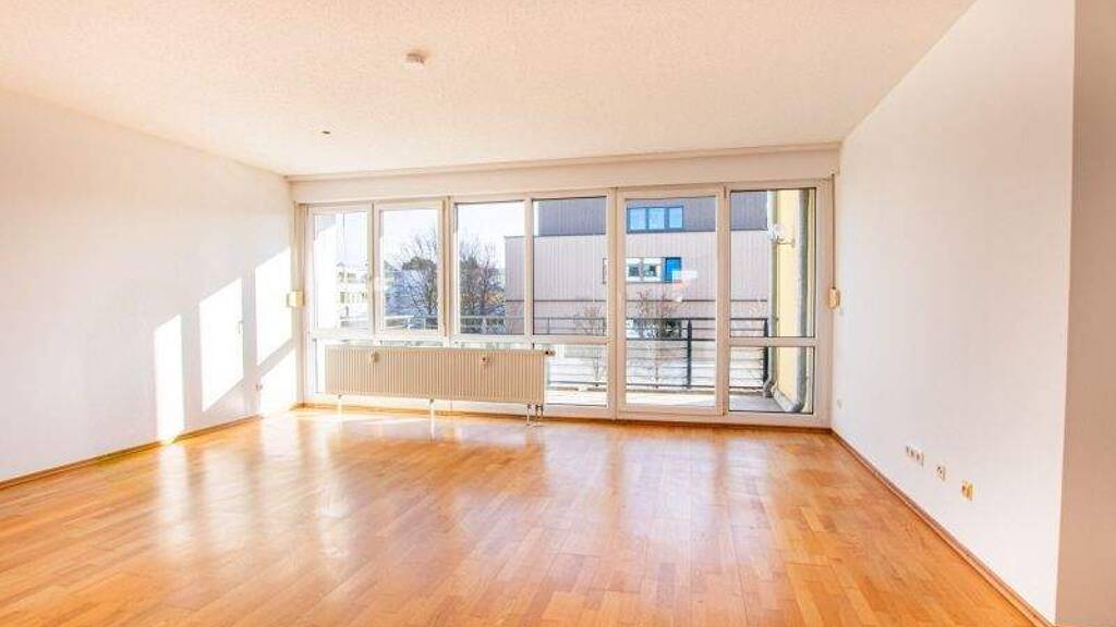Das großzügige Wohn- und Esszimmer beeindruckt durch seine große Fensterfront. Der Raum wird von Tageslicht durchflutet und bietet direkten Zugang zum Südbalkon, der mit einer Markise ausgestattet ist. Die helle, großzügige Raumwirkung schafft ein modernes Wohngefühl und vielseitige Einrichtungsmöglichkeiten.