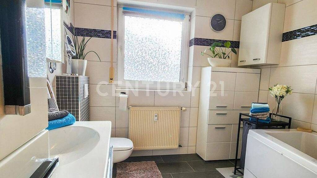 - Bad mit Badewanne, Waschbecken, Toilette und Fenster
