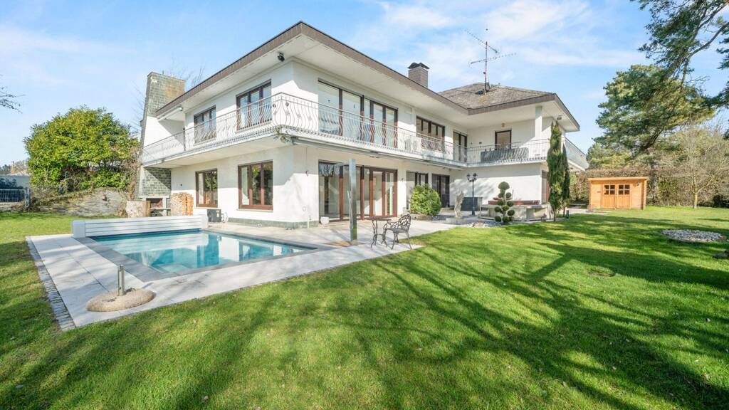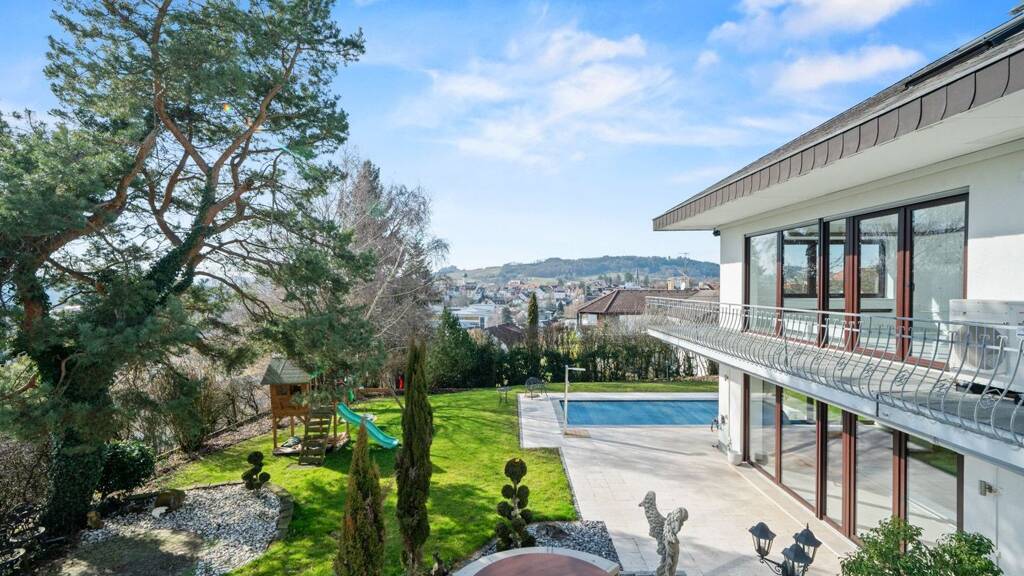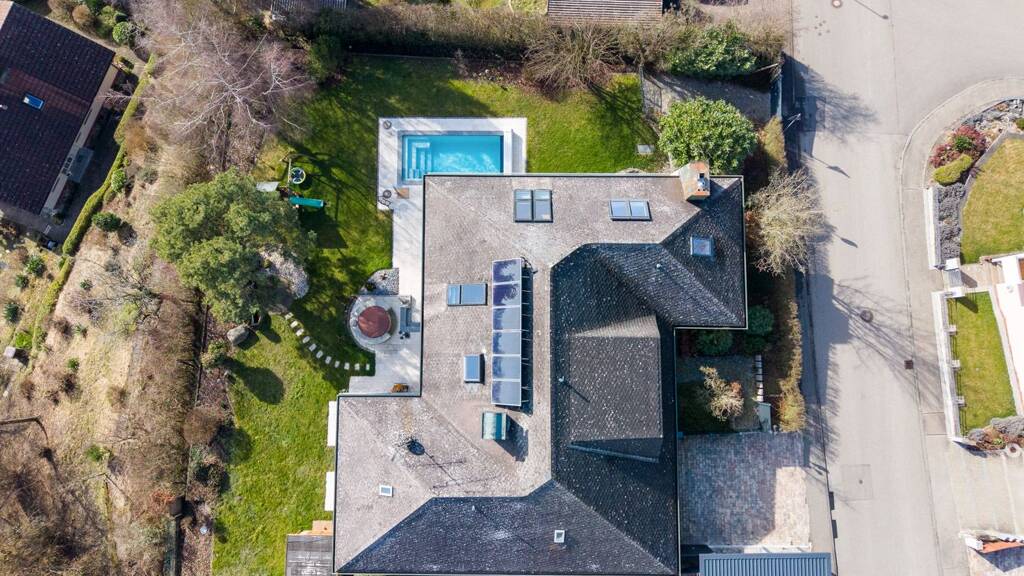 Die Villa wurde auf einem etwa 1.600 m² großen Grundstück in begehrter Höhenlage erbaut. Empfangen werden Sie von einer großen Eingangshalle die sowohl in die Küche mit Speisekammer und einem großen Esszimmer als auch in das sonnendurchflutete Wohnzimmer mit angrenzenden Kaminzimmer führt. Des Weiteren befinden verfügt das Erdgeschoss über drei weitere Zimmer und ein Tageslichtbadezimmer. Der über 40 Meter lange Balkon verbindet auf dieser Etage alle nach Süden ausgerichteten Räume und bietet einen Blick über die Stadt Stockach sowie den stilvoll angelegten Garten. Im Obergeschoss gibt es zwei große Schlafzimmer, ein Badezimmer und gegenüberliegend einen weiteren Raum, der ideal als Ankleide genutzt werden kann. Zusätzlich bietet die Ebene eine weitere Ausbaufläche von ca. 121 m² Grundfläche, die zu mindestens zwei weiteren Zimmern umgebaut werden kann. Im Gartengeschoss beherbergt die Villa ein großes Schwimmbad mit einer kürzlich erneuerten Entfeuchtungsanlage, eigener Dusche, Sauna und Toilette. Die Pooltechnik sowie die 2019 erneuerte Gasheizung befinden sich im Keller unter dem Schwimmbad. Vier weitere Zimmer zur flexiblen Nutzung, ein Badezimmer, ein Gäste WC und eine Küche mit separatem Zugang komplettieren das Gartengeschoss. Dieser Teil kann mit wenig Aufwand von der Villa abgeteilt werden und als Einliegerwohnung genutzt werden. Dank des bedacht eingebetteten Grundstücks und der Begrünung ist der Garten nicht einsehbar und verfügt damit über viel Privatsphäre. Ein weites Highlight der Villa ist neben dem Schwimmbad der neu angelegte Außenpool welcher aufgrund der Südausrichtung den ganzen Tag über in der Sonne liegt und über eine Wärmepumpe beheizt werden kann. Der zusätzliche Whirlpool im Garten rundet das Wellnessangebot dieser exklusiven Immobilie ab. Eine große Doppelgarage mit Wallbox und Zugang zum Haus sowie ein Carport der ebenfalls mit einer Wallbox ausgestattet ist bieten ausreichend Stellplatzmöglichkeiten für Ihre Fahrzeuge. Die Villa wurde in den letzten Jahren laufend instandgehalten. Dabei wurden Fenster, die Glasfassade in der Eingangshalle, die Heizung und die Markise erneuert. Ein Glasfaseranschluss wurde verlegt und einzelne Räume mit einer Klimaanlage ausgestattet.