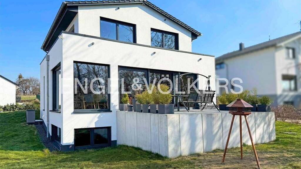 Das 2021 errichtete Einfamilienhaus verfügt über fünf Zimmer, zwei Bäder und eine große Doppelgarage. Zentraler Wohnraum ist das ca. 54 m² große Wohn- und Esszimmer mit offener Küche. Eine große 3-fach verglaste, bodentiefe Fensterfront sorgt für viel Licht und bietet einen herrlichen Blick in die Natur.