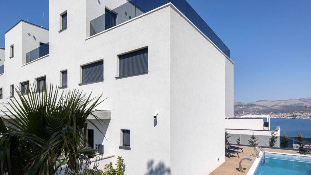 Die Villen befinden sich auf der wunderschönen Insel Ciovo, in erhöhter Lage mit atemberaubendem Blick. Mit einer Gesamtwohnfläche von 437 m2 sind die Villen völlig identisch und jede Villa erstreckt sich über drei Etagen.