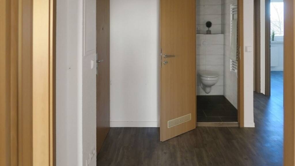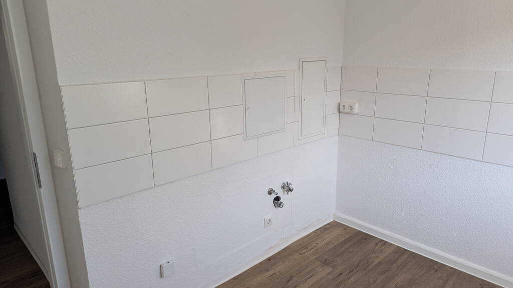Weiß gestrichene Wände, moderne Innentüren, moderner Plankenbelag in allen Räumen und eine modern geflieste Nassstrecke in der Küche sorgen danach für ein modernes behagliches Wohngefühl. Das Bad ist schick gefliest und verfügt über eine ebenerdige Dusche. Im Flur finden Sie eine zusätzliche Abstellmöglichkeit. Den Balkon in Westrichtung erreichen Sie über das Wohnzimmer.