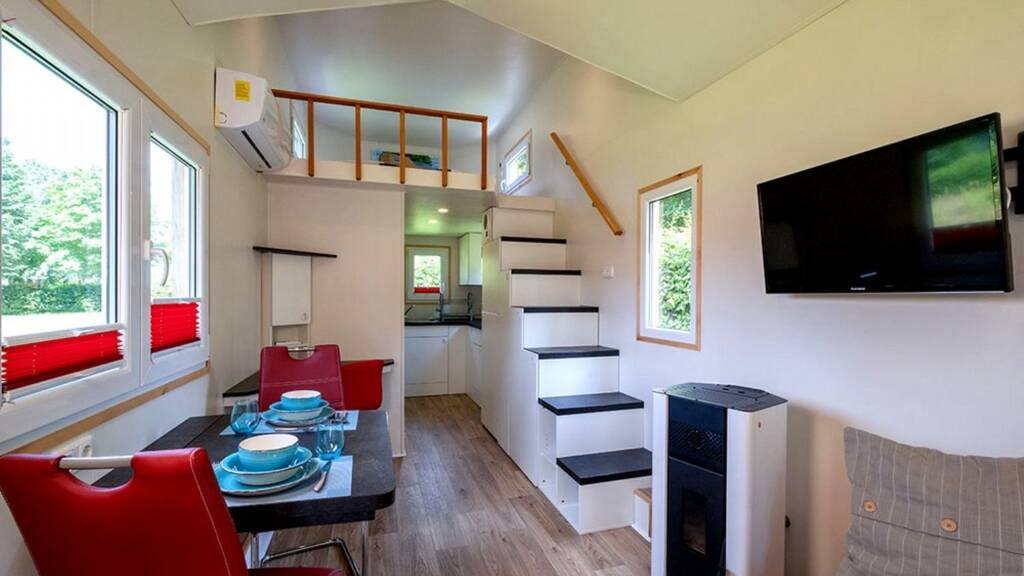 Die Beheizung erfolgt über die Infrarot - Deckenheizung sowie über einen elektronisch gesteuerte Pelletofen. Auf Wunsch steht zusätzlich auch eine Klimaanlage zur Verfügung. Die Tiny-Klimaanlage sorgt für Kühlung, Heizung, Belüftung und Entfeuchtung.