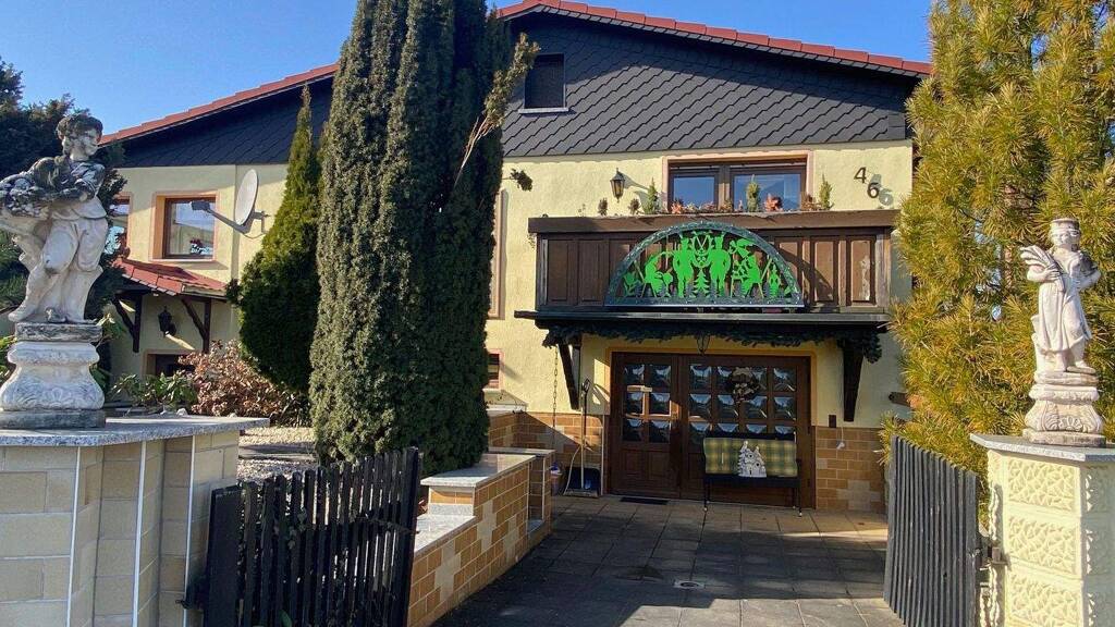 Das angebotene Einfamilienhaus des DDR-Haustyps HB5 wurde in den Jahren 1984/1985 in massiver Bauweise errichtet und im Anschluss bezogen. Es handelt sich um ein vollständig unterkellertes Wohnhaus, das sich sowohl für eine große Familie als auch für die Kombination von Wohnen und Arbeiten eignet. Im Erdgeschoss stehen fünf helle und großzügig geschnittene Räume zur Verfügung. Die Raumaufteilung umfasst eine große Wohnküche, einen offenen Essbereich, ein geräumiges Schlafzimmer, ein Kinderzimmer sowie ein modernes Duschbad mit ebenerdiger Dusche und WC. Ergänzt wird diese Ebene durch Flur und Diele. In späteren Jahren wurde ein massiv errichteter, lichtdurchfluteter Wintergarten angebaut, der den Wohnbereich erweitert. Dieser verfügt über einen gemauerten Kamin und bietet direkten Zugang zum nach Süden bis Südwesten ausgerichteten Garten. Die Wohnfläche im Erdgeschoss beträgt insgesamt ca. 145 m². Das Untergeschoss ist ebenfalls in Wohnraumqualität ausgebaut und über eine massive Treppe erreichbar. Hier befindet sich eine ca. 65–70 m² große Büroeinheit mit Besprechungsbereich, eine Personalküche, der Heizraum sowie zwei weitere Räume, die derzeit als Wellness- und Fitnessbereich genutzt werden. Ein großzügiger und heller Eingangsbereich sowie ein zusätzlicher Zugang zum Garten sind ebenfalls vorhanden. Aufgrund der Aufteilung eignet sich diese Ebene ideal zur Nutzung als Einliegerwohnung oder separate Gewerbeeinheit. Der Außenbereich ist hochwertig gestaltet und vielseitig nutzbar. Ein großzügiger, überdachter und weitgehend verglaster Freisitz bietet wetterunabhängigen Komfort. Zur Ausstattung gehören ein hochwertiger Jacuzzi, eine Bar sowie ein gemauerter Grillkamin. Weiterhin umfasst das Grundstück zwei große, massiv errichtete Garagen mit ausreichend Platz für Wohnwagen oder Wohnmobile, ergänzt durch ein vorgelagertes Doppelcarport sowie zusätzliche Pkw-Stellplätze. Darüber hinaus befinden sich auf dem Grundstück ein ca. 55 m² großes Poolhaus mit technischer Ausstattung, eine Gartenlaube mit separatem Geräteschuppen, ein Gartenteich sowie ein stabiles Gewächshaus. Das Wohnhaus wurde regelmäßig instand gehalten und befindet sich in einem gepflegten Zustand. Flächenübersicht: • Wohnfläche: ca. 145 m² • Gewerbefläche (Untergeschoss): ca. 70 m² • Nutzfläche (u. a. Heizung, Wirtschaftskeller, Gartenhaus, Garagen): ca. 130 m² Durchgeführte Modernisierungsmaßnahmen: • 1994: Einbau einer Ölzentralheizung (Buderus) • 1994: Erneuerung der Fenster • 1995: Erneuerung der Elektroinstallation und Sanitärleitungen • 1998: Modernisierung der Bäder (Erd- und Untergeschoss) • 1998: Großteil der Bodenbeläge erneuert (Fliesen) • 1999: Einbau einer Fußbodenheizung im Büro (Untergeschoss) • 1999: Errichtung einer Doppelgarage • 2020: Bau einer vollbiologischen Kläranlage Die Dacheindeckung wurde in den 1990er Jahren mit Prefa-Dachelementen erneuert.