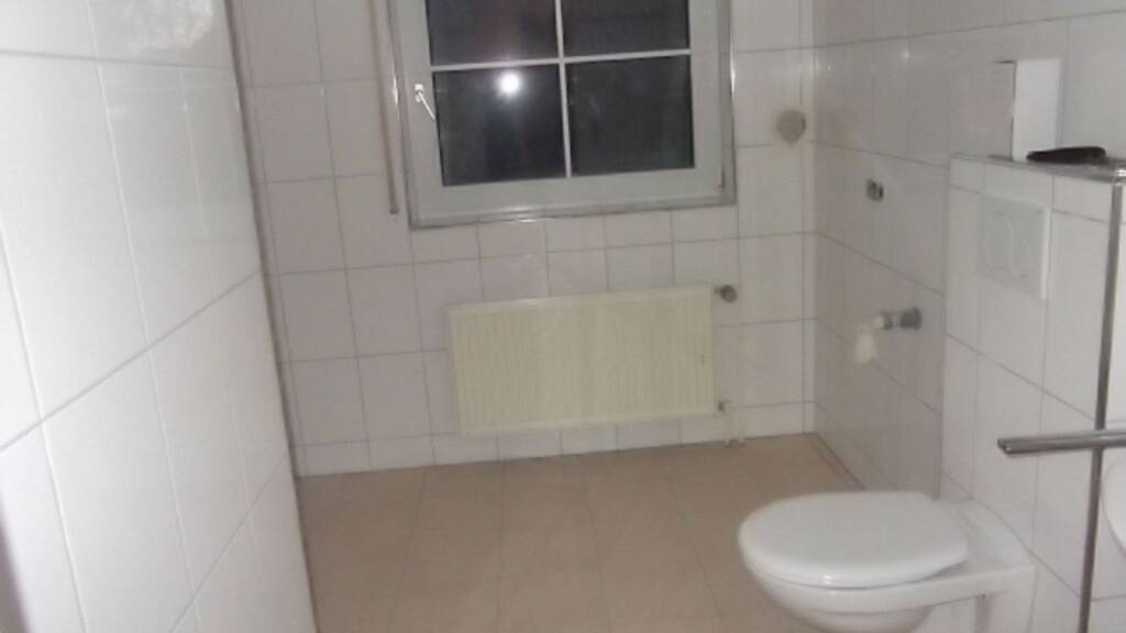 Das helle Tageslichtbad wurde komplett neu gestaltet. Die Wände und der Fußboden wurden hell und modern gefliest und mit einer ebenerdigen Dusche, einem hängenden WC und einem Waschtisch ausgestattet. Die Sanitärobjekte sind weiß.
