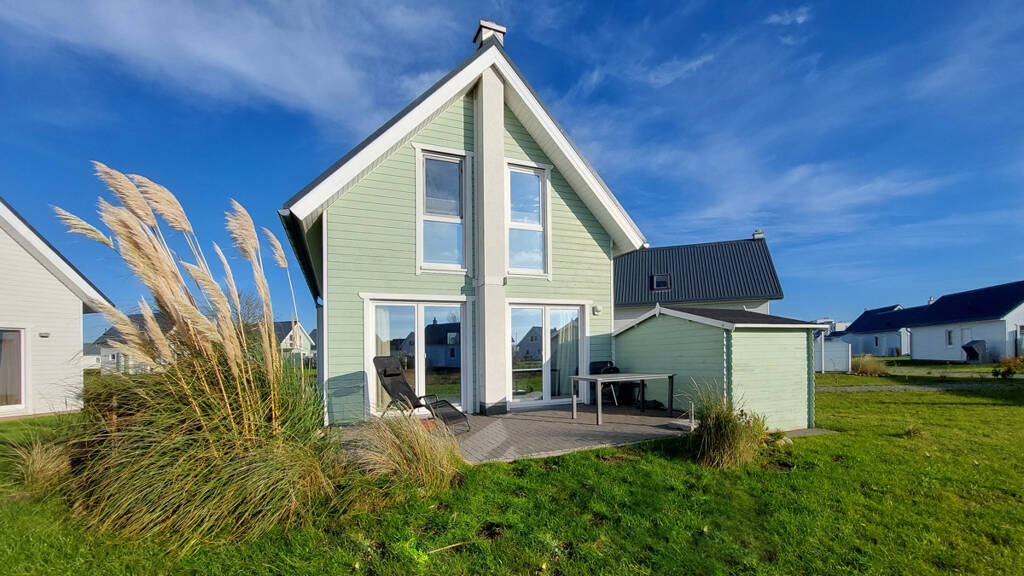 Dieses 75 m² umfassende Holzferienhaus liegt direkt an der Ostsee und bietet Urlaubern ein idyllischer Rückzugsort. Moderner Komfort wird mit der natürlichen Schönheit der Umgebung verbunden. Die Anordnung der Ferienhäuser mit charmanter Architektur fügt sich harmonisch in die Landschaft ein und strahlt eine warme, einladende Atmosphäre aus.