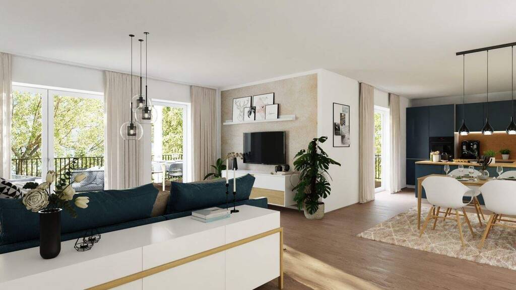 Der großzügige Wohn- und Essbereich mit offener Küche bildet das Herzstück der Wohnung und bietet Zugang zum sonnigen Balkon – ideal zum Entspannen oder für gesellige Stunden im Freien. Zwei weitere Räume eignen sich flexibel als Schlafzimmer, Kinderzimmer oder Homeoffice. Das moderne Badezimmer ist mit einer bodengleichen Dusche und hochwertigen Sanitärobjekten ausgestattet.