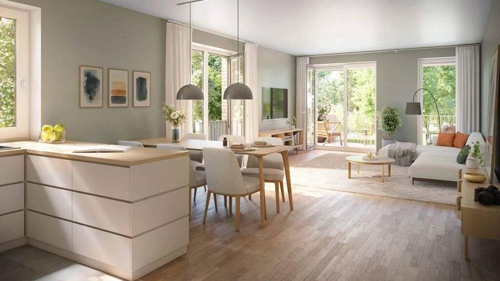 Bereits beim Betreten der großzügigen 2-Zimmer-Wohnung wird die helle, offene Raumgestaltung ins Auge fallen, die für ein außergewöhnliches Wohngefühl sorgen wird. Bodentiefe Fenster durchfluten die Räume mit Tageslicht und eröffnen den Blick ins Grüne. Vom weitläufigen Wohn- und Essbereich aus gelangen Sie direkt auf die Terrasse mit eigenem Garten - ein perfekter Rückzugsort im Freien.