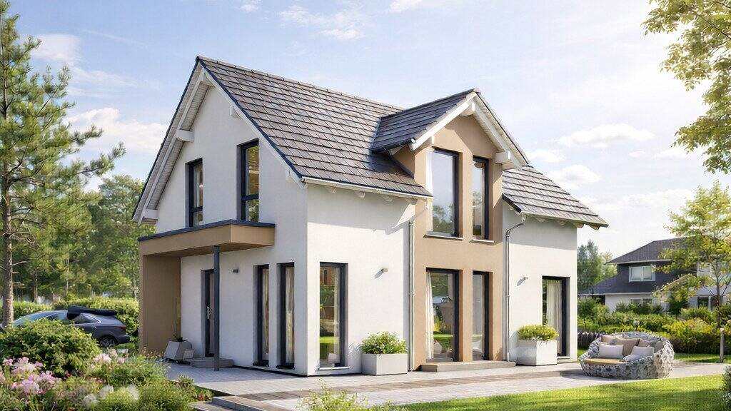Dein Haus wird mit einer vorkonfigurierten I-KON-Lösung ausgestattet, inklusive Photovoltaikanlage und Speicherbatterie. Die moderne Wärmepumpentechnik mit Komfortlüftung sorgt für ein angenehmes Raumklima und effizientes Heizen. Im Zuhause-Paket sind hochwertige Bodenbeläge, Türen und stilvolle Sanitäranlagen enthalten, ebenso Fliesen für das Erdgeschoss und bodengleiche Duschen mit Echtglasabtrennung.