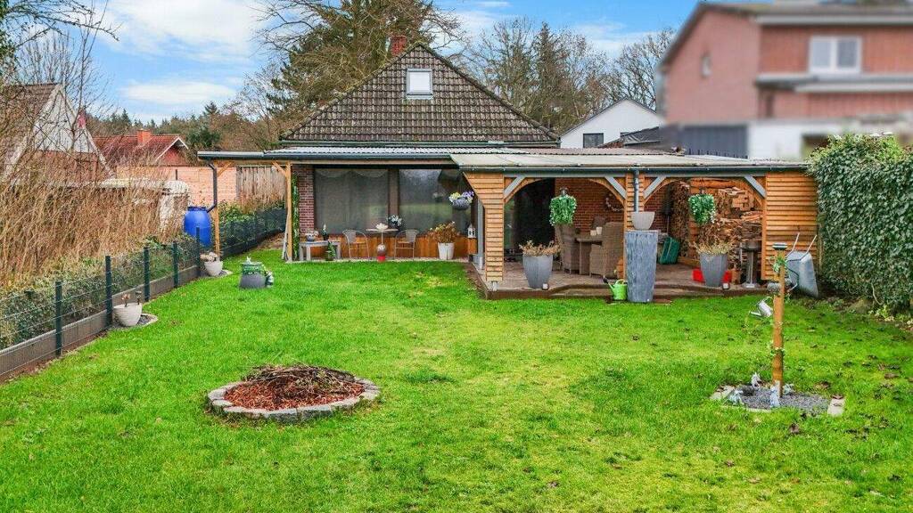 Im Garten sorgt ein großzügiger Unterstand für Schutz vor dem typischen norddeutschen Wetter. Durch das Doppelcarport vor dem Gebäude ist auch das Abstellen der Fahrzeuge problemlos möglich.