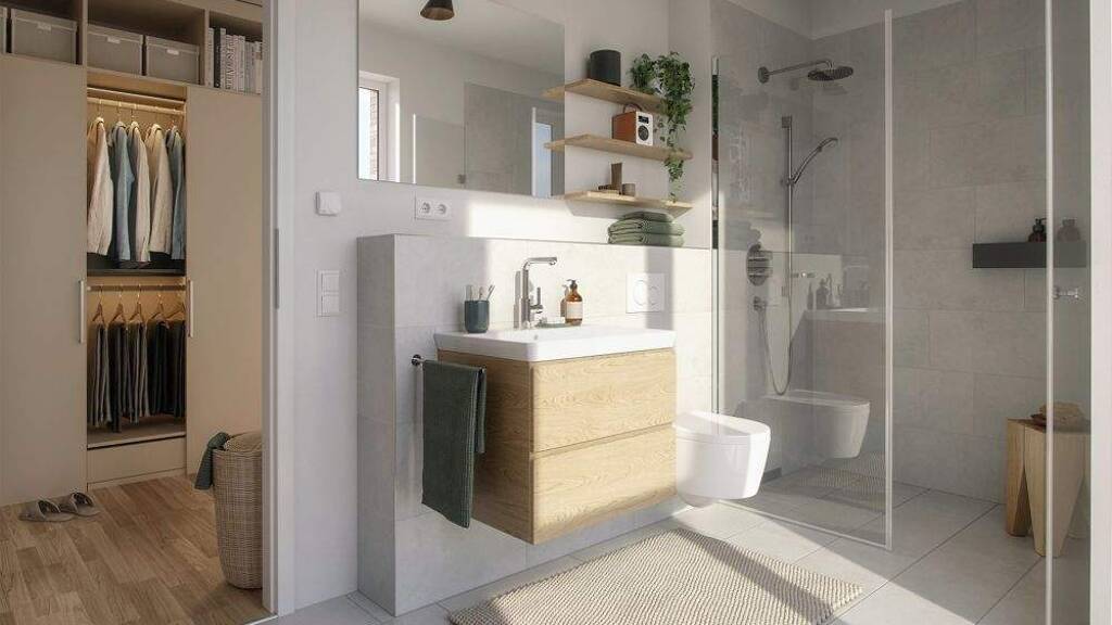 Qualität auf allen Ebenen: Bei der Materialauswahl kommt es neben der Ästhetik auch auf die Haptik und Langlebigkeit an. Wir haben für alles gesorgt. Die bodengleiche Walk-In-Dusche und die Handtuchheizkörper sind dabei nur einige der Highlights. Alles umgeben von Sanitärobjekten namhafter Hersteller.
