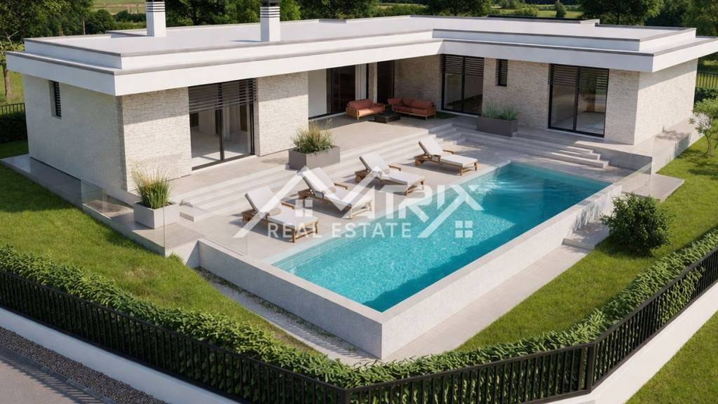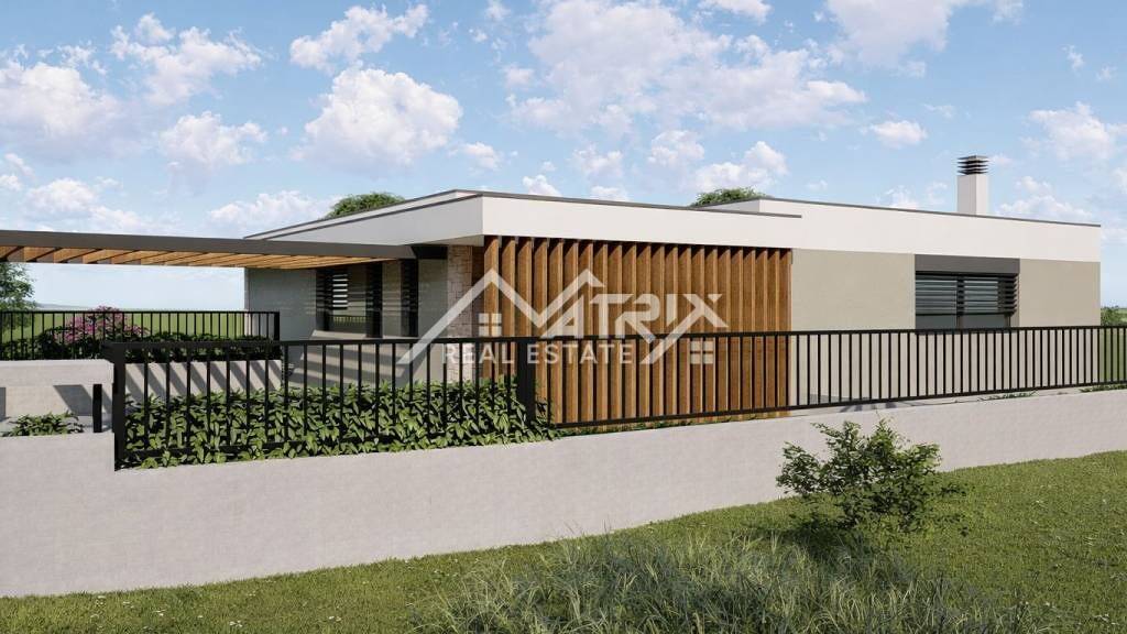 In einem ruhigeren Teil von Galizana, im weiteren Raum Pula, steht ein Baugrundstück mit 759 m² zum Verkauf - in regelmäßiger und sehr gut nutzbarer Form. Ein großer Vorteil ist die bereits erteilte Baugenehmigung für ein ebenerdiges Haus (Netto 143 m²), ein Nebengebäude mit 11 m² sowie einen Pool mit 20 m², wodurch sich die Zeit bis zum Baubeginn deutlich verkürzt und die Umsetzung erleichtert. Die kommunalen Abgaben sind bezahlt, und Strom- sowie Wasseranschlüsse befinden sich in unmittelbarer Nähe des Grundstücks - eine ideale Ausgangsbasis für einen schnellen Baustart. Das Haus ist als moderner, ebenerdiger Bau in L-Form geplant, mit klar getrenntem Tages- und Nachtbereich. Das Zentrum bildet ein großzügiger Open-Space-Wohnbereich mit Küche, Essplatz und Wohnzimmer sowie Ausgang auf eine überdachte Terrasse, die Innen- und Außenbereich funktional verbindet. Im linken Flügel befindet sich ein Schlafzimmer mit zugehörigem Bad - ideal als Gästebereich oder separater Privatbereich. Der rechte Flügel bildet die Nachtzone mit zwei Schlafzimmern, jeweils mit eigenem Bad, ergänzt durch ein separates WC und einen Abstellraum. Der Eingang führt in einen Flur, der alle Räume praktisch miteinander verbindet. Die Lage überzeugt durch Ruhe und zugleich sehr gute Anbindung: Pula, Fazana und die Strände der Umgebung sind in kurzer Zeit erreichbar, ebenso Hauptverkehrsachsen und Infrastruktur. Ideal als Familienhaus mit Pool oder als Investment für eine hochwertige touristische Vermietung in Südistrien.