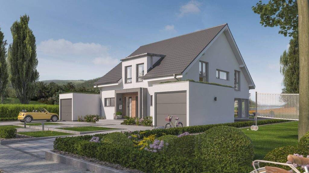 Entdecke deine maßgeschneiderte Doppelhaushälfte von LivingHaus, die Raum für Lebensfreude auf 117 m² bietet. Mit vier Zimmern und durchdachter Architektur schafft dieses Zuhause ein Ambiente voller Licht und Komfort. Der charakteristische Zwerchgiebel verleiht dem Satteldach eine offene Silhouette und sorgt für eine lichtdurchflutete Atmosphäre, besonders in den Kinderzimmern. Zwei großzügige Schlafzimmer und zwei funktionale Badezimmer unterstreichen den Anspruch an Familienkomfort. Die überdachte Eingangszone empfängt dich einladend, während die beiden begrünten Garagen Nachhaltigkeit leben. Mit LivingHaus erhältst du mehr als nur ein Haus: Eine vollumfassende Betreuung macht dein Bauprojekt zum Genuss. Die individuell geplante Traumküche wird zum Herzstück deines Zuhauses, ausgestattet mit modernster Technik und cleveren Stauraumlösungen. Die praktische Bau-Cockpit-App begleitet dich transparent durch alle Projektphasen. Innovative Konzepte wie I-KON - Intelligentes Bauen garantieren Energieeffizienz, während exklusive Finanzierungsmodelle deine Hausreise komfortabel gestalten. Das umfassende Zuhause-Paket und das DIY-Ausbau-Coaching runden das maßgeschneiderte Angebot ab. Mit LivingHaus wird dein Traumhaus zur greifbaren Realität.
