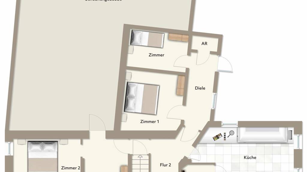 Haupthaus: das äußere Erscheinungsbild des Gebäudes ist denkmalgeschützt ein Um- und Ausbau zu Wohnzwecken ist möglich es wurden bereits verschiedene Einrichtungen demontiert im EG wurde bis in den 90er Jahren eine Gaststätte betrieben im I. & II. OG befinden sich sanierungsbedürftige Wohnräume Stau- und Lagerfläche bietet die angrenzende Scheune