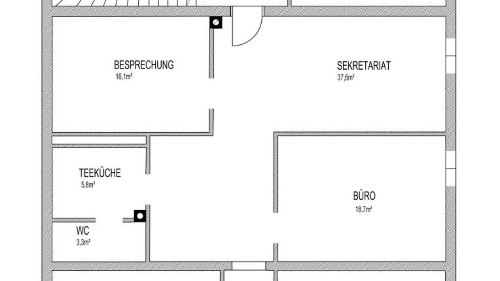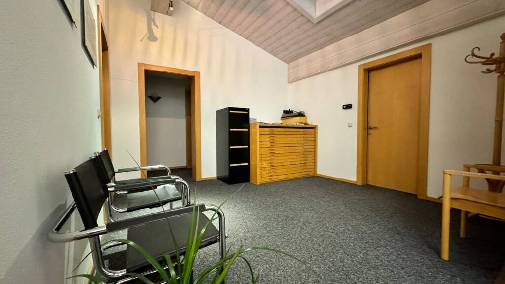 Die Bürofläche unterteilt sich in 3 Büros, Besprechungsraum, Empfang, Teeküche und WC.