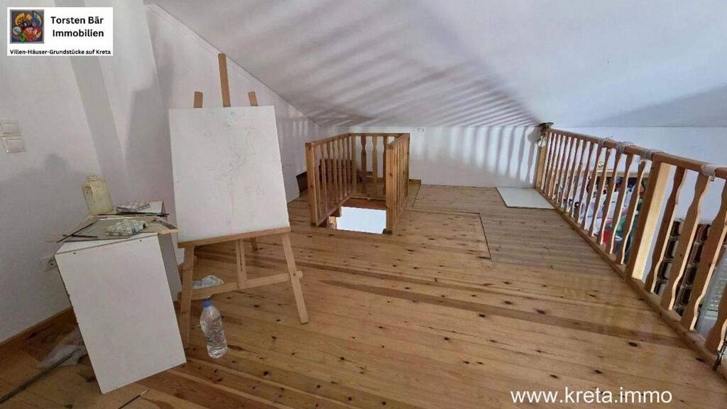 Im Zentrum thront der offene Wohnbereich mit integrierter Küche - ein Ort für lange Abende mit Familie und Freunden, wo der Duft frischer kretischer Speisen die Luft erfüllt. Ein gemütlicher Kaminofen sorgt für Wärme an kühleren Tagen und verleiht dem Raum Seele. Die moderne Fliesenböden mit edlen Inlays unterstreichen den hellen, einladenden Charakter, während Aluminiumfenster und -türen mit Doppelverglasung und praktischen Rolläden für Komfort und Energieeffizienz sorgen. Über allem schwebt eine besondere Note: eine integrierte Empore, die als zusätzlicher Schlafraum, gemütliches Arbeitszimmer oder Leseecke genutzt werden kann - ein versteckter Schatz, der den Raum spielerisch erweitert.