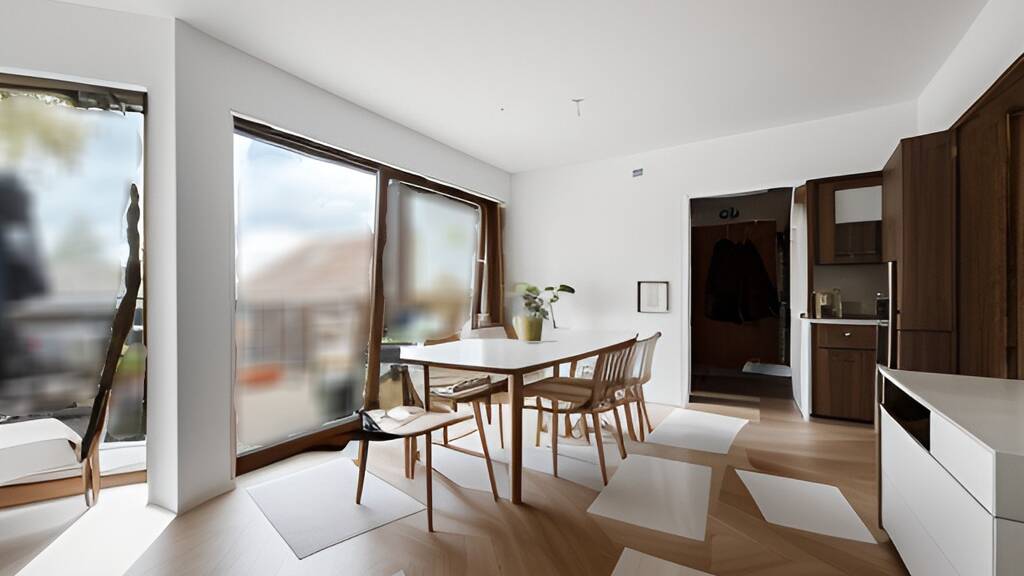 Weiter führt der Weg zum Gäste-WC mit Dusche, bevor Sie in den offenen Wohnbereich gelangen. Die moderne Küche ist funktional geschnitten und geht in den großzügigen Essbereich über. Bodentiefe Fenster sorgen hier für eine angenehme Helligkeit und schaffen eine freundliche Atmosphäre. Vom Essbereich aus haben Sie direkten Zugang zum Balkon - der perfekte Ort, um den Feierabend zu genießen.