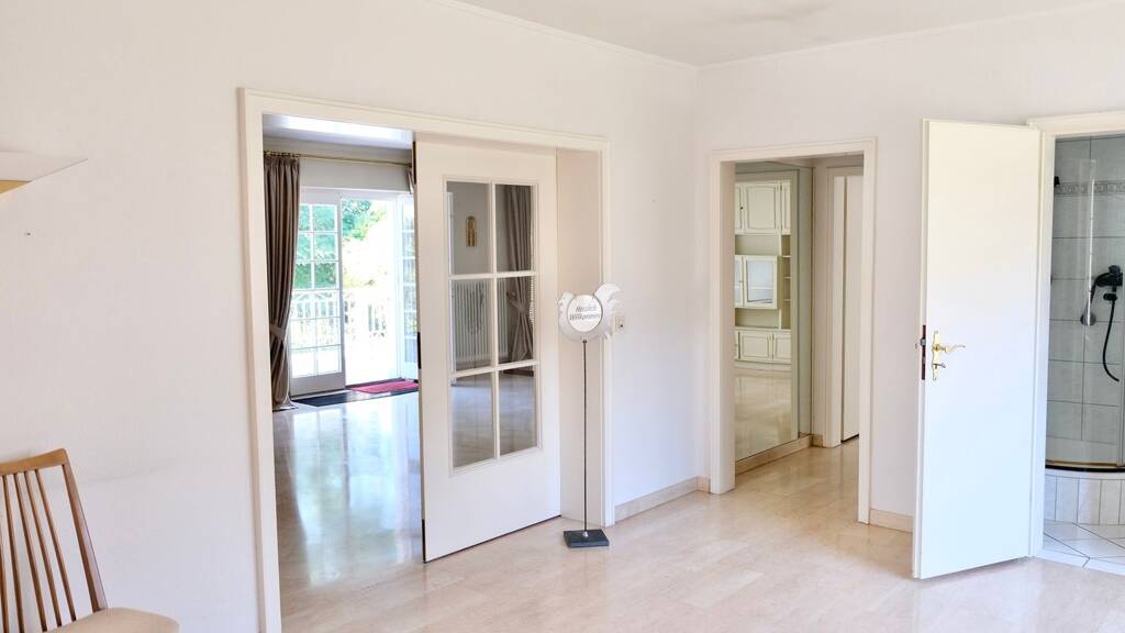 Besondere Ausstattungsmerkmale .Hochwertige und exklusive Materialauswahl in der gesamten Wohnung .Edle Marmorböden in allen Bereichen (außer Schlafzimmer und Bäder) .Stilvoller offener Kamin im Wohnzimmer .Charmante Sprossenfenster, die ein besonderes Ambiente schaffen .Elektrischer Rollladen im Schlafzimmer .Deckenventilator im Schlafzimmer für angenehmes Raumklima an heißen Tagen .Elegante LED-Deckenspots für eine stimmungsvolle Beleuchtung .Großzügiger Balkon mit ca. 29 m2, der einen herrlichen Blick auf den gepflegten Garten bietet .Eigener Garagenstellplatz sowie ein großzügiger Dachboden für zusätzlichen Stauraum