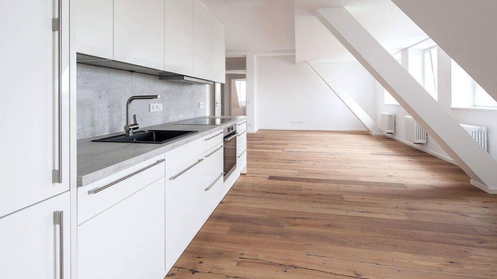 Der offene Wohn- und Kochbereich mit moderner, heller Einbauküche und angrenzender Speis bildet das Herzstück der Wohnung. Die Südausrichtung sorgt für ein außergewöhnlich helles Wohngefühl und einen freien Blick in die Ferne.