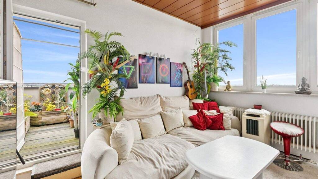Das Herzstück der Wohnung ist der gemütliche Wohnbereich mit Zugang zur großzügigen Dachterrasse. Von hier aus genießen Sie einen herrlichen Weitblick über die Umgebung - perfekt, um nach einem langen Tag zu entspannen oder die Sonne zu genießen. Die vorhandene Einbauküche fügt sich optimal in den Raum ein und bietet Ihnen alles, was Sie für den Alltag benötigen.