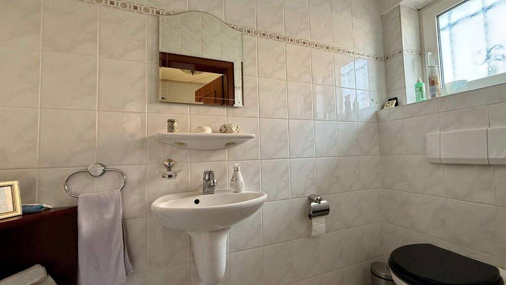 Im Erdgeschoss befinden sich ein großzügiger Wohnbereich, eine geräumige Küche, zwei Schlafzimmer, ein Badezimmer mit Dusche, Badewanne, Toilette und Waschtisch, ein kleines Gäste-WC sowie ein Hausflur.