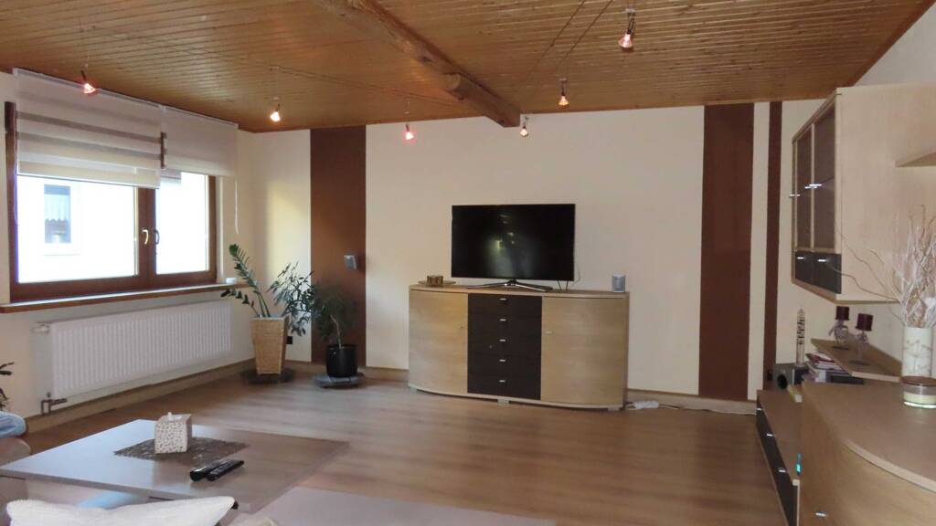 In der Wohneinheit finden wir in der unteren Ebene ein geräumiges Wohnzimmer und eine offene Küche, welche mit Einbaumöbeln ausgestattet wurde, das Bad, zwei Kinderzimmer, Dachterrasse, Flur und Hauswirtschaftsraum. Im Dachspitz ist ein riesiges Schlafzimmer vorhanden, welches nach oben offen gestaltete wurde und eine zweite Schlafebene beinhaltet. Von dort aus hat man einen herrlichen Blick über die Dächer der Innenstadt und in Richtung der Talsperre. Im Dachgeschoß ist auch die neue Gas-Brennwerttherme von Buderus mit Warmwasserbereitung untergebracht.