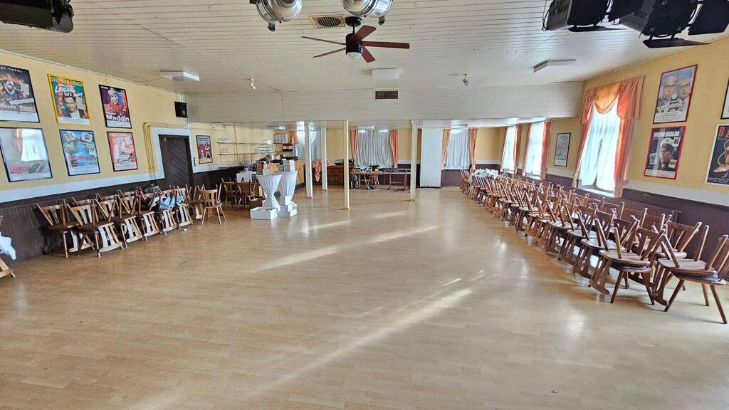 OG: Saal, Musikbühne, Bar, Toilettenanlage, Wohneinheit (2 ZKB, Balkon, ca. 70m²), Flur