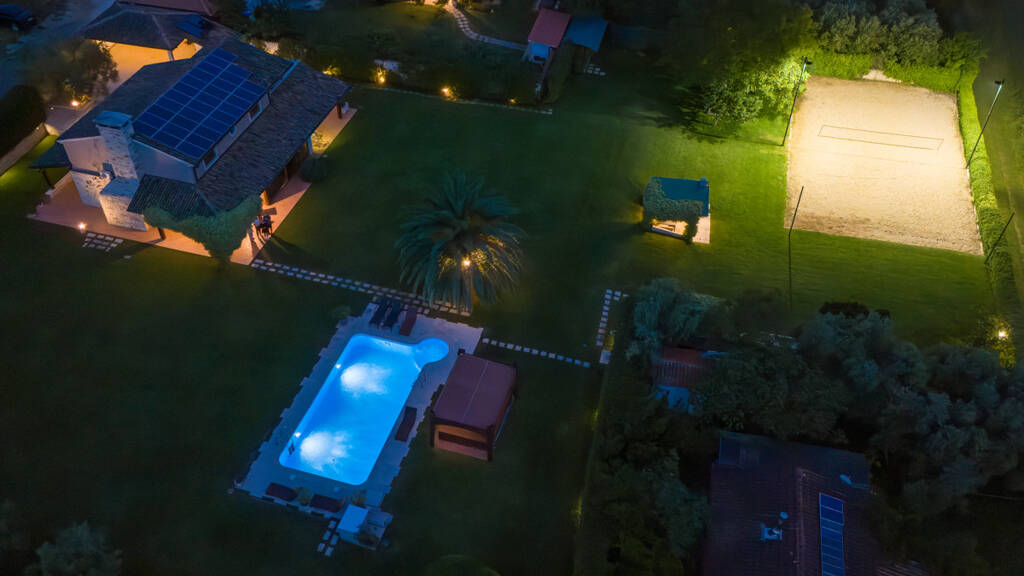 Zu den weiteren Highlights der Immobilie gehören der 50 m² große Swimmingpool mit Hydromassage-Funktion, ein eigener Beachvolleyballplatz, eine moderne Videoüberwachung, ein Alarmsystem sowie eine Bewässerungsanlage für Rasenflächen und Pflanzen, die die Pflege des wunderschönen Gartens erleichtert.