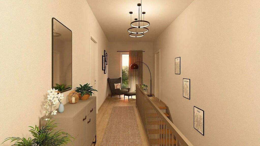 Im Obergeschoss befinden sich neben dem Reich der Eltern zwei identisch große Kinderzimmer sowie ein geräumiges Bad mit Wanne, Dusche und WC.