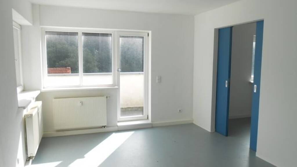 Die Wohnung besteht aus Wohn-, Schlafzimmer, Küche, Bad sowie ein kleines Arbeits-/oder Kinderzimmer. Ebenfalls vorhanden ist ein kleiner Abstellraum. An das Wohnzimmer schließt sich der Balkon mit Blick über Ruhla an. Das Bad verfügt über eine Dusche sowie ein kleines Fenster. Die geräumige Küche hat E-Herdanschluss und ebenfalls ein Fenster.