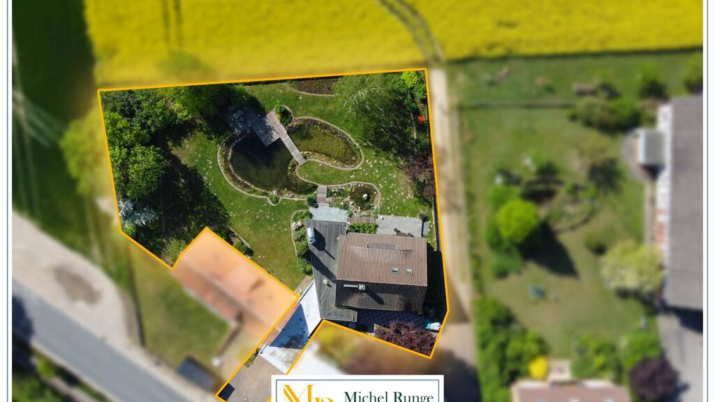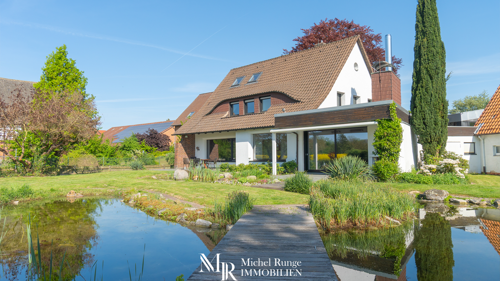 Dieses großzügige Einfamilienhaus mit sieben Zimmern liegt auf einem weitläufigen, liebevoll gestalteten Gartengrundstück mit Teichanlage und drei sonnigen Terrassen.