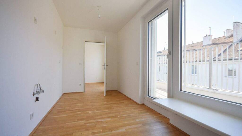 Diese 2 Zimmer-Wohnung im 4. Stock mit ca. 43,75 m² verfügt über eine separate Küche mit Anschlüssen, ein Wohnzimmer, ein Schlafzimmer, ein Bad mit Dusche, WC und Waschmaschinenanschluss sowie einen Vorraum. Highlight der Wohnung ist die ca. 12,93 m² große Terrasse, die von der Küche und von beiden Räumen begehbar ist.