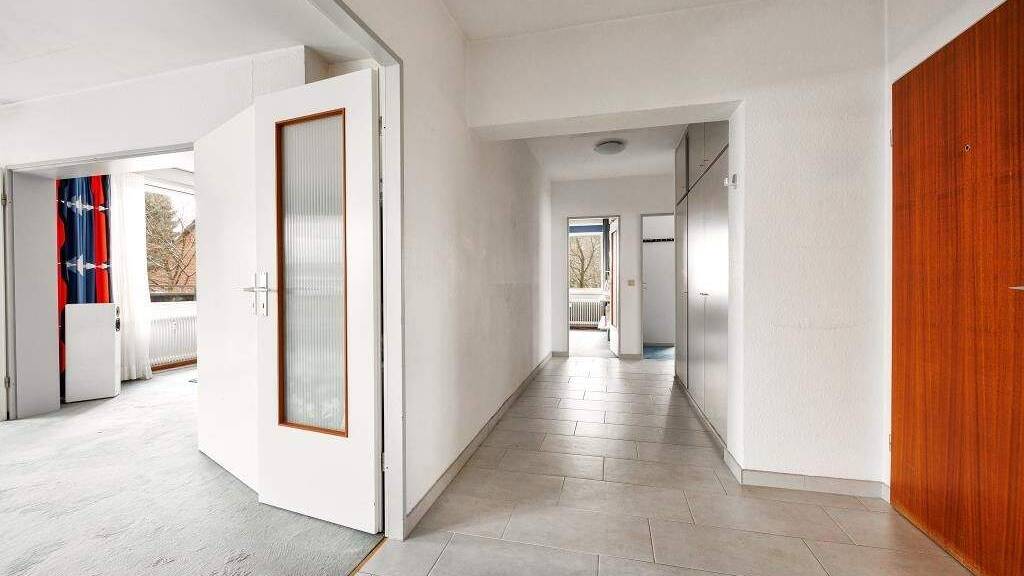 Über eine großzügige Diele mit praktische Einbau-Garderobe, gelangt man in alle Räume der Wohnung. Das Herzstück bilden die zwei großzügigen Wohnräume, die mittels einer Doppeltür miteinander verbunden sind und fließend ineinander übergehen. Beide Räume sind mit Teppichboden ausgelegt und verfügen jeweils über eine große Loggia nach Süden, die zum Verweilen im Freien einlädt. Baulich war eines dieser Zimmer ursprünglich als zwei Schlafräume konzipiert und kann bei entsprechendem Bedarf leicht wieder entsprechend umgestaltet werden. Das aktuelle Schlafzimmer ist nach Nordwesten ausgerichtet und ebenfalls mit Teppichboden ausgestattet.