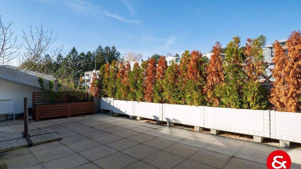 Die stilvolle Terrasse lädt dazu ein, den Tag mit einem Kaffee im Freien zu beginnen oder den Abend mit einem Glas Wein ausklingen zu lassen. Genießen Sie den Blick auf die grüne Umgebung und die ruhige Nachbarschaft, während Sie in vollkommener Ruhe entspannen.
