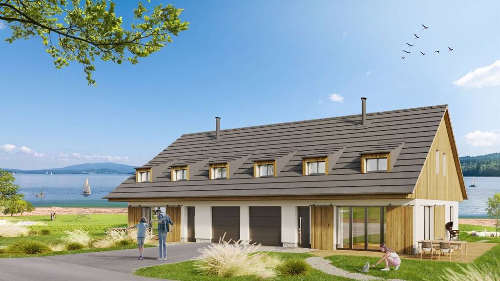 Das Objekt wurde von einem renommierten Architekturbüro entworfen - im Einklang mit der traditionellen Sumava-Architektur und mit Fokus auf hochwertige Baumaterialien. Das Erdgeschoss jeder Einheit verfügt über ein geräumiges Entrée mit Zugang zur Garage und ein separates WC. Daran schließt sich ein großer Wohnbereich mit Küche, Essbereich und Zugang zu einer wunderschönen Terrasse mit einzigartigem Blick auf den Lipno-Stausee an. Im Dachgeschoss befinden sich ein Hauptschlafzimmer mit eigenem Bad, zwei weitere Zimmer, ein Abstellraum sowie ein weiteres Badezimmer mit Vorbereitung für eine Sauna.