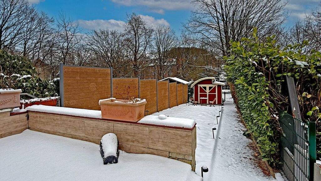 Die Terrasse ist großzügig angelegt und führt in den länglichen Garten, der durch Hecken und Einfriedungen angenehm gefasst wirkt. Ein Gartenhaus ergänzt den Außenbereich und bietet praktische Abstellfläche für Geräte, Fahrräder oder saisonale Ausstattung.