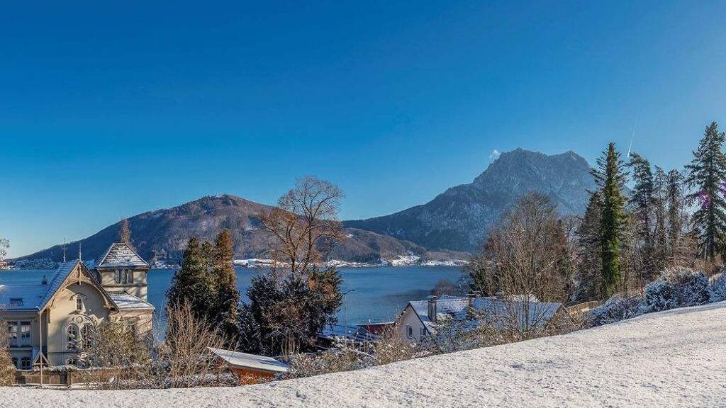 Das Grundstück schmiegt sich harmonisch in die Landschaft des Traunsees ein. Der freie Blick reicht über das Wasser hinweg bis zum Traunstein, dessen markante Silhouette das Panorama dominiert.