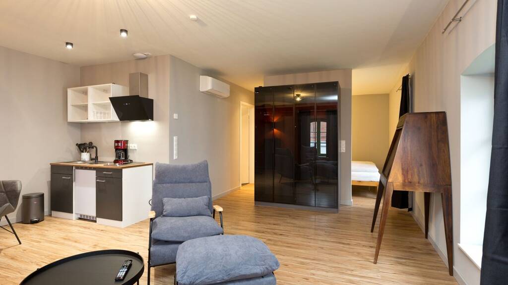 Aus dem Fenster genießen Sie einen traumhaften Blick auf die Umgebung und lassen den Alltag hinter sich. Die Wohnung befindet sich im 1. Obergeschoss eines sanierten Pferdestalls und verfügt über einen eigenen Außenstellplatz für Ihr Auto.