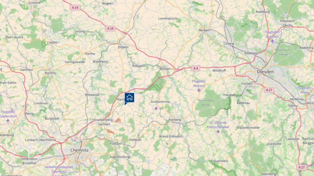 Der Bahnhof ist in ca. 10 min. fußläufig zu erreichen. Von hier aus gelangt man mit der City-Bahn in regelmäßigen Abständen, mit einer Fahrzeit von ca. einer halben Stunde, zum Hauptbahnhof Chemnitz. Die Autobahnanschlussstelle Hainichen erreichen Sie in ca.7 Fahrminuten.