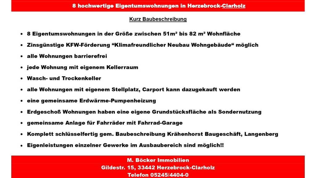 - zinsgünstige KfW-Förderung möglich (klimafreundlichen Wohnungsbau) KfW 40 - alle Wohnungen barrierefrei gestaltet - ideal für alle Lebensphasen - Eigener Kellerraum zu jeder Wohnung - Gemeinschaftlicher Wasch- und Trockenkeller - Eigener Stellplatz inklusive, Carport kann auf Wunsch dazugekauft werden - Gemeinschaftliche Erdwärmepumpe für umweltfreundliches Heizen - Fahrradgarage zur gemeinschaftlichen Nutzung - Komplett schlüsselfertig - lt. Baubeschreibung von Fa. Krähenhorst, Langenberg - Individuelle Eigenleistungen möglich; einzelne Gewerke im Ausbaubereich können nach Absprache selbst übernommen werden - Schallschutzverglasung