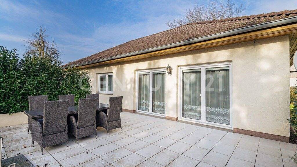 Das im Jahre 2001 errichtete Einfamilienhaus im gefragten Bungalowstil überzeugt mit einem praktischen und barrierearmen Grundriss auf einer Wohnebene. Viel Licht dank großer Fensterflächen und Raumhöhen von ca. 2,65 m überzeugen die ganze Familie. Das ca. 30 m² große Wohnzimmer bietet mit bodentiefen und mit Rollläden ausgestatteten Fensterelementen Zugang zur großen und ideal ausgerichteten Süd-West Terrasse. Hier genießen Sie Ihre Privatsphäre. Die Terrasse lässt sich zur Beschattung mit einem Sonnensegel überspannen. Des Weiteren erwarten Sie drei separat begehbare Schlaf- und Kinderzimmer mit Größen von ca. 11 bis 18,5 m² welche ebenso mit Rollläden ausgestattet sind sowie die geräumige Küche mit praktischer Nebeneingangstür, ein Gäste-WC sowie ein Hausanschlussraum mit der Heizungsanlage.