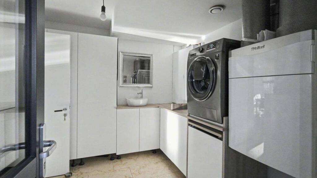 Im gesamten Haus wurde edler Naturstein verbaut, der ein zeitlos elegantes Wohnambiente schafft und höchste Qualitätsansprüche erfüllt. Die energieeffiziente Bauweise als A+ Haus wird durch eine moderne Sole-Wasser-Wärmepumpe ergänzt, die mit einem COP-Wert von bis zu 4,7 eine besonders hohe Effizienz bietet. In Kombination mit der zentralen Lüftungsanlage mit Wärmerückgewinnung sowie dreifach verglasten Fenstern sorgt sie ganzjährig für ein angenehmes Raumklima bei dauerhaft niedrigen Energiekosten.