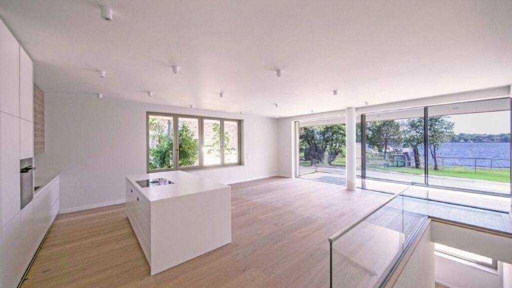On entering the apartment, the view opens up to the large living room with floor-to-ceiling panoramic windows. Like a painting, the large Wannsee lake shows itself in all its beauty at all times of the day and year.