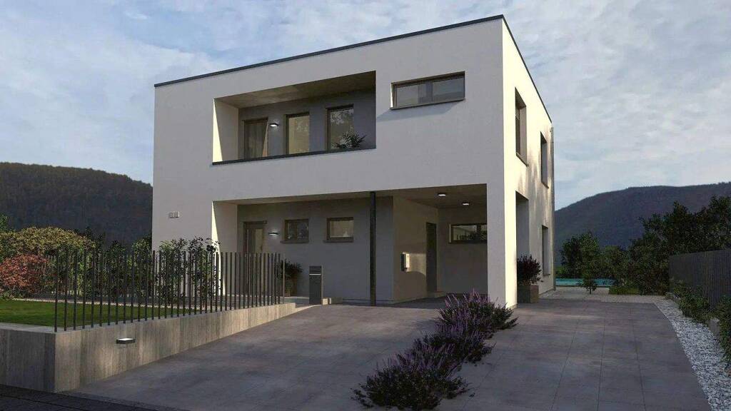 Die geradlinige Struktur der zweigeschossigen Flachdachvilla wird durch die Fassadenrücksprünge und die asymmetrische Gestaltung architektonisch ergänzt. Clever und vor allem für fast jedes Grundstück geeignet: der integrierte Carport.