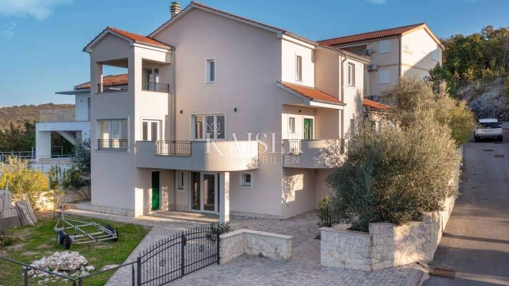 Kaiser Immobilien vermittelt den Verkauf eines wunderschönen, freistehenden Einfamilienhauses in einzigartiger Lage in Klimno auf der Insel Krk. Der Meerblick von fast jeder Etage ist etwas ganz Besonderes. Diese Aussicht, die Nähe zum Meer und die Düfte des Mittelmeers machen diese Immobilie zu etwas ganz Besonderem. Klimno ist die größte Stadt in der Bucht und eine der ältesten der Region. Sie liegt an der Ostseite der Insel Krk und ist von Natur aus gut vor den Einflüssen der Bora und des Jugo geschützt. Die kleine, ruhige und romantische Stadt wird von der Kirche St. Clemens aus dem 14. Jahrhundert geschmückt. Klimno ist bekannt für sein vielfältiges gastronomisches Angebot und seine Restaurants, die neben Meeresfrüchten und anderen Spezialitäten auch den typischen einheimischen Wein sowie einen Yachthafen mit Anlegestellen im Meer und an Land anbieten. Neben den Stammgästen ist Klimno auch ein beliebtes Ausflugsziel inmitten mediterraner Vegetation, die sowohl auf dem Wasser- als auch auf dem Landweg erreichbar ist. In der Stadt selbst gibt es mehrere schöne Strände, und in der Nähe befindet sich auch ein Hundestrand. Das Haus steht auf einem 680 m² großen Grundstück, nur 200 m vom Meer entfernt, und erstreckt sich über drei Etagen. Es verfügt über drei separate Wohneinheiten mit einer Gesamtwohnfläche von 266 m². Die größere, zweigeschossige Wohneinheit im ersten Obergeschoss mit 159 m² bietet einen großzügigen, offenen Wohnbereich mit Wohnzimmer, Küche und Essbereich, der sich zu einer Terrasse mit herrlichem Blick auf das Meer und die Bucht von Klimno öffnet. Auf derselben Etage befinden sich außerdem ein Abstellraum, ein WC, ein Büro mit separatem Eingang, zwei Parkplätze und eine kleine Terrasse. Eine offene Treppe aus istrischem Naturstein führt in den zweiten Obergeschoss mit drei Schlafzimmern. Das größte Schlafzimmer verfügt über ein eigenes Badezimmer, einen begehbaren Kleiderschrank und einen Balkon mit atemberaubendem Blick auf das Meer, die Bucht und die umliegenden Dörfer. Ebenfalls auf dieser Etage befinden sich ein weiteres Badezimmer und ein Hauswirtschaftsraum, der in ein zusätzliches Schlafzimmer umgewandelt werden kann. Die kleinere, 47 m² große Wohneinheit im hinteren Teil des Hauses besteht aus einem offenen Wohn-/Essbereich mit Küche, einem Badezimmer und einem Schlafzimmer. Das Haus verfügt über einen großzügigen Garten, eine Terrasse mit Meerblick und einen Parkplatz. Im vorderen Teil des Erdgeschosses befindet sich ein 42 m² großes Studio mit einem Zimmer und einem Badezimmer. Direkt daneben liegt der 5 m² große Heizraum. Für Bau und Ausstattung wurden hochwertige Materialien und Geräte verwendet. Das gesamte Gebäude ist mit einer Fußbodenheizung ausgestattet, die durch eine Wärmepumpe des renommierten Herstellers Daikin, einen Warmwasserspeicher und eine Daikin-Split-Klimaanlage gespeist wird. Die Kombination aus hochwertigen PVC-Fenstern und -Türen und einer 10 cm dicken Polystyrolfassade sorgt für eine außergewöhnliche Energieeffizienz, die durch den Energieausweis der Klasse A+ bestätigt wird. Im Innenbereich wurden Schreinerarbeiten eines renommierten italienischen Herstellers, hochwertige Keramik und Sanitäreinrichtungen verbaut. Die Innen- und Außentreppen sind aus natürlichem Kanfanar-Stein aus Istrien gefertigt. Sämtliche Installationen (Wasser, Strom, Vorbereitung für Solarthermie und Photovoltaikanlage) wurden im Untergeschoss in Richtung Heizraum verlegt. Das Anwesen besticht durch seinen mediterran gestalteten Garten mit jahrhundertealten Olivenbäumen, Rosmarin, Lavendel, Strohblumen, Oleander und weiteren Pflanzen. Die Flächen sind mit Betonpflastersteinen, entlang des Hauses teilweise mit istrischem Stein gepflastert. Die umlaufenden Mauern sind vollständig mit natürlichem Benkovac-Stein verkleidet. Die Zäune (innen und außen) sowie der Gartenzaun sind aus anthrazitfarbenem Schmiedeeisen gefertigt. Vor dem Haus befindet sich eine ca. 7 x 4 m große Fläche für den Bau eines Swimmingpools mit Meerblick - der einzige noch nicht fertiggestellte Bereich des Gartens. Ein exzellentes Anwesen, ideal für ganzjährigen Genuss im mediterranen Ambiente oder als Investition im Tourismussektor. Empfohlen vom Makler. Alle Dokumente sind vollständig, das Haus verfügt über eine Nutzungsgenehmigung. ID-Code: 105-315. Die Maklerprovision für den Käufer beträgt 3 % zzgl. MwSt. und wird im Falle des Kaufs mit Abschluss des ersten Rechtsakts fällig.