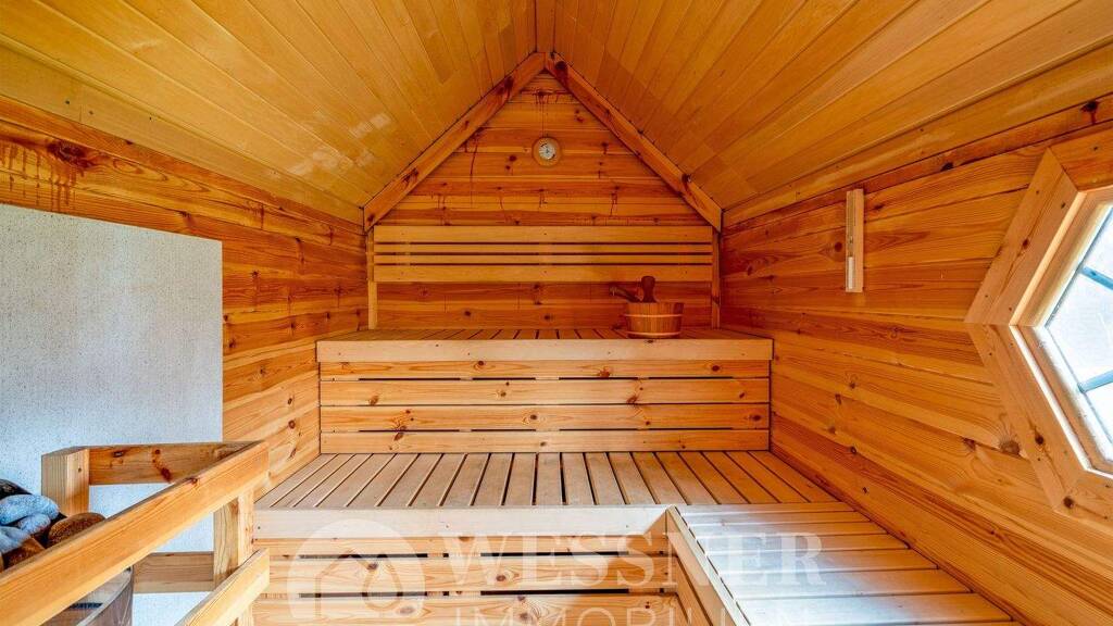 Eine Doppelgarage, ein Carport, die großzügige Terrasse und eine Grillkota mit Sauna runden diese Immobilie ab.