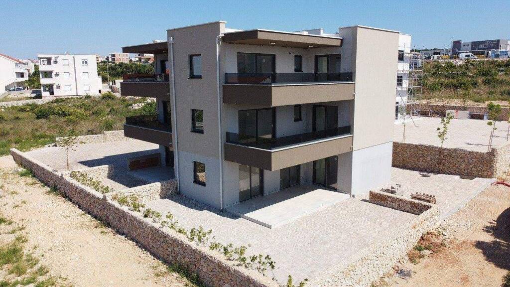 Zur Wohnung gehören zwei Parkplätze. Dank der leichten Hanglage bietet die Wohnung einen Panoramablick über die gesamte Bucht von Novalja.
