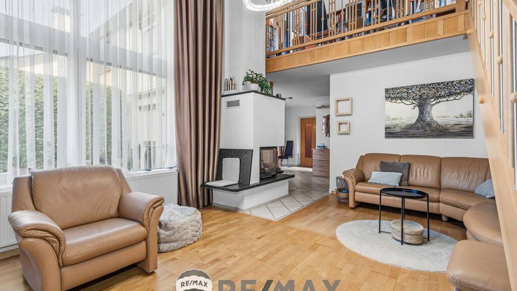 Im Erdgeschoss erwartet Sie ein einladendes Vorzimmer, eine separate Küche sowie ein vielseitig nutzbares Kabinett bzw. Schlafzimmer. Ergänzt wird diese Ebene durch einen praktischen Abstellraum, ein Badezimmer, ein WC sowie ein weiteres Schlafzimmer. Das Herzstück des Hauses bildet das großzügige Wohnzimmer mit integriertem Essbereich. Von hier genießen Sie einen wunderbaren Blick in den Garten sowie hinauf zur offenen Galerie im Obergeschoss, was dem Raum eine besondere Weite und Eleganz verleiht.